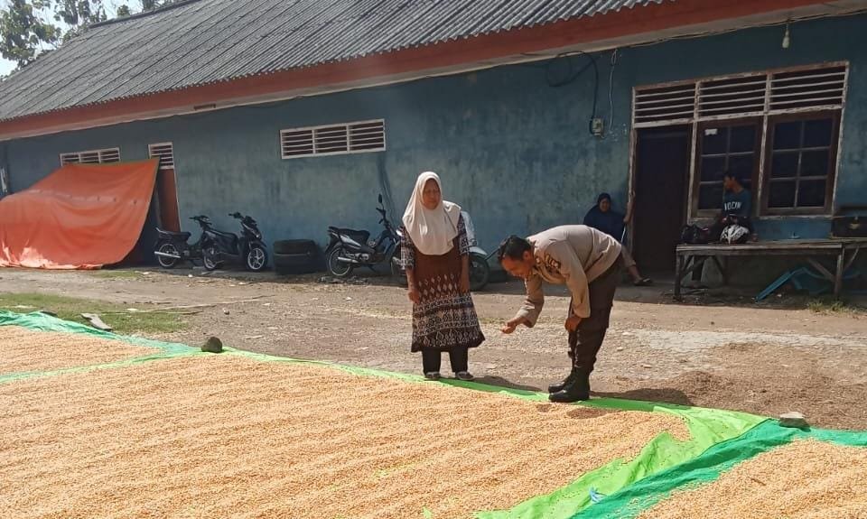 Bripka I Made Yuli Dwi Putra Bhabinkamtibmas Polsek Soromandi Polres Bima Polda NTB memantau dan membantu proses pengeringan jagung milik warga di Desa Binaannya Kamis (22/5/25) siang kemarin.